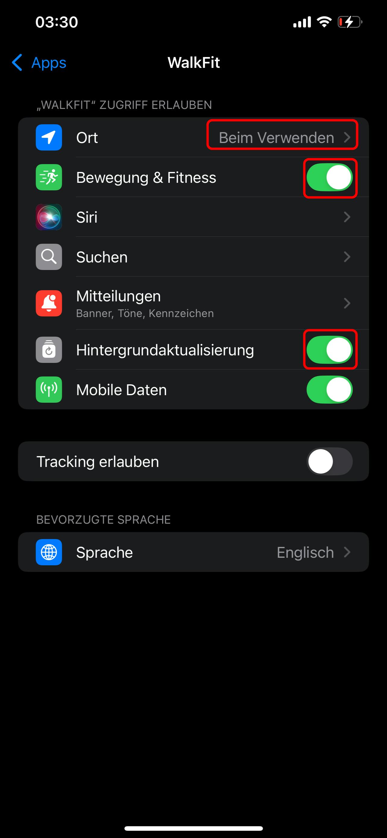 Um zu prüfen, ob WalkFit Zugriff auf die benötigten Daten hat, gehe bitte auf deinem Handy zu Einstellungen > WalkFit > Erlaube WalkFit den Zugriff auf alle untenstehenden Bereiche: