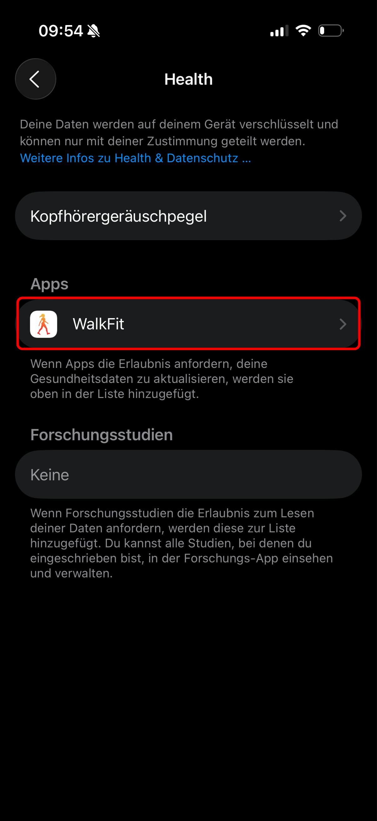 Um zu überprüfen, ob WalkFit mit der Gesundheits-App synchronisiert ist, gehe bitte zu Einstellungen auf deinem Handy > Datenschutz > Gesundheit > WalkFit.