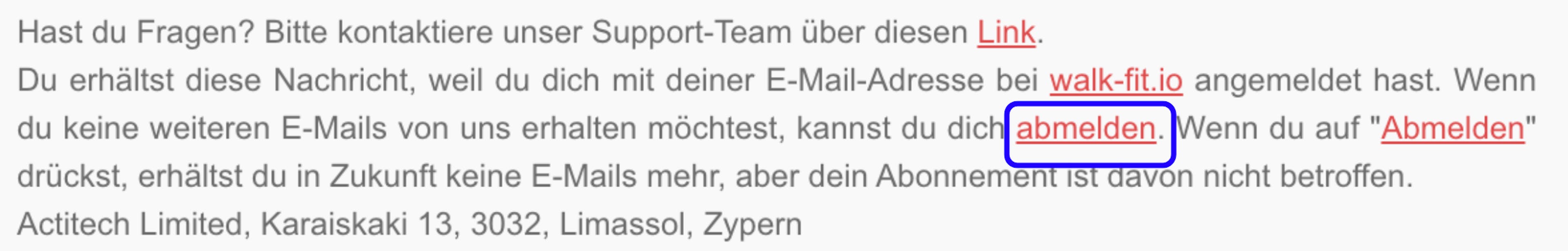Wenn Sie keine E-Mails mehr von uns erhalten möchten, können Sie sich am Ende jeder unserer E-Mails über den Abmelden-Hyperlink von unserem Verteiler abmelden, wie unten gezeigt:
