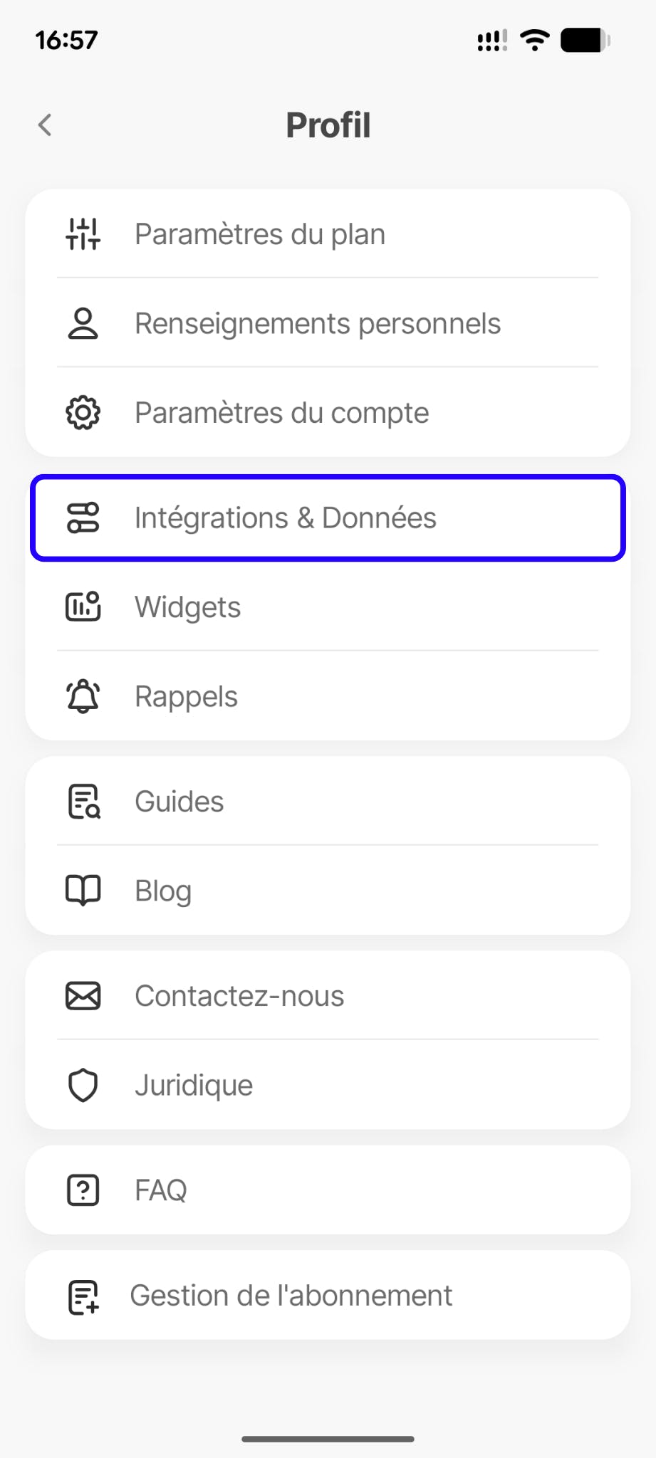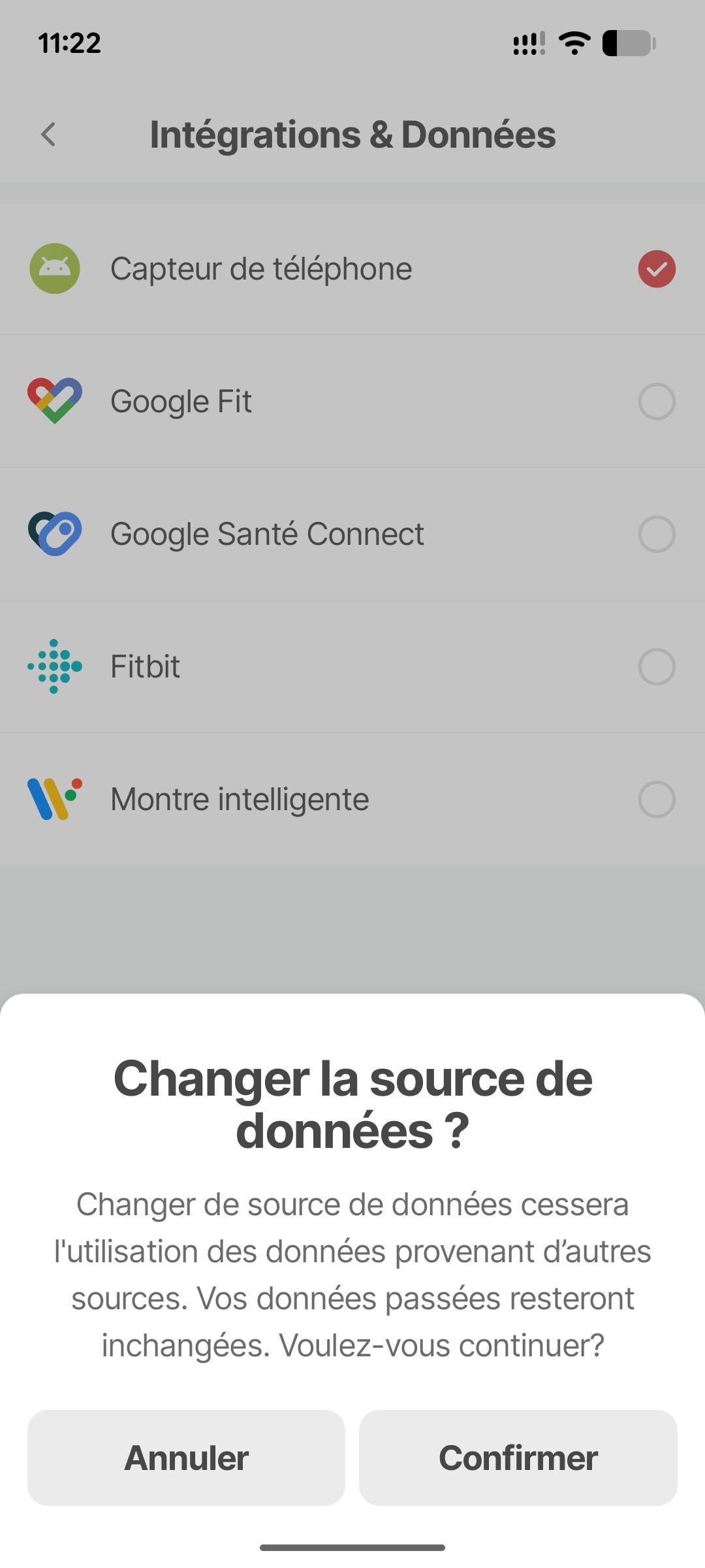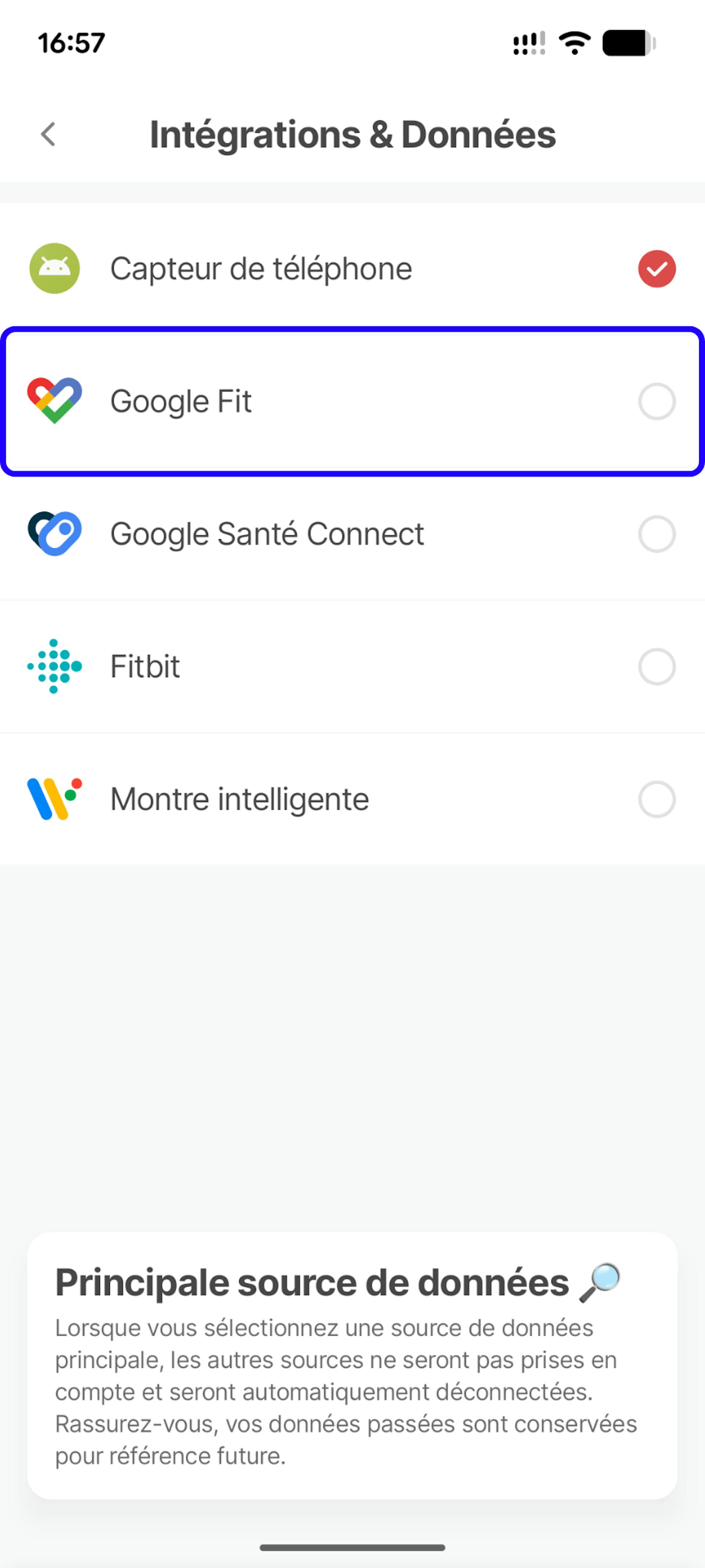 Notre application vous permet de synchroniser les données concernant les calories, la distance, les pas et le temps d'entraînement avec Google Fit. Il vous suffit de configurer cette intégration en suivant ces étapes simples :