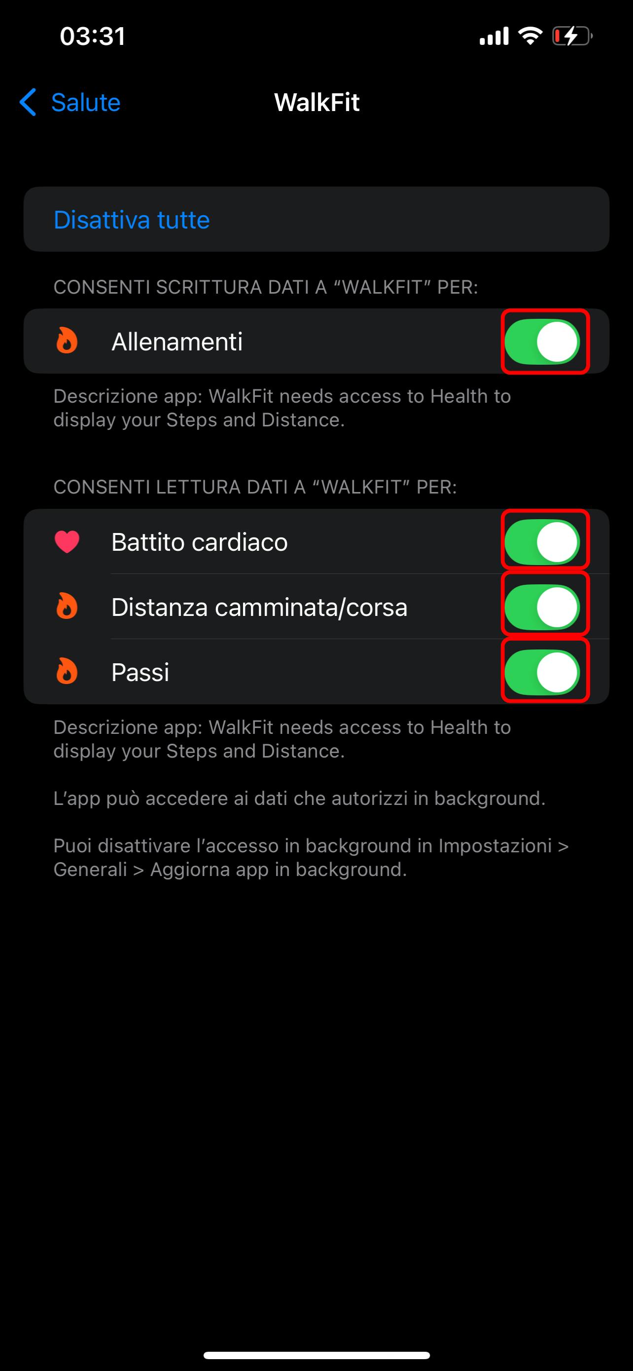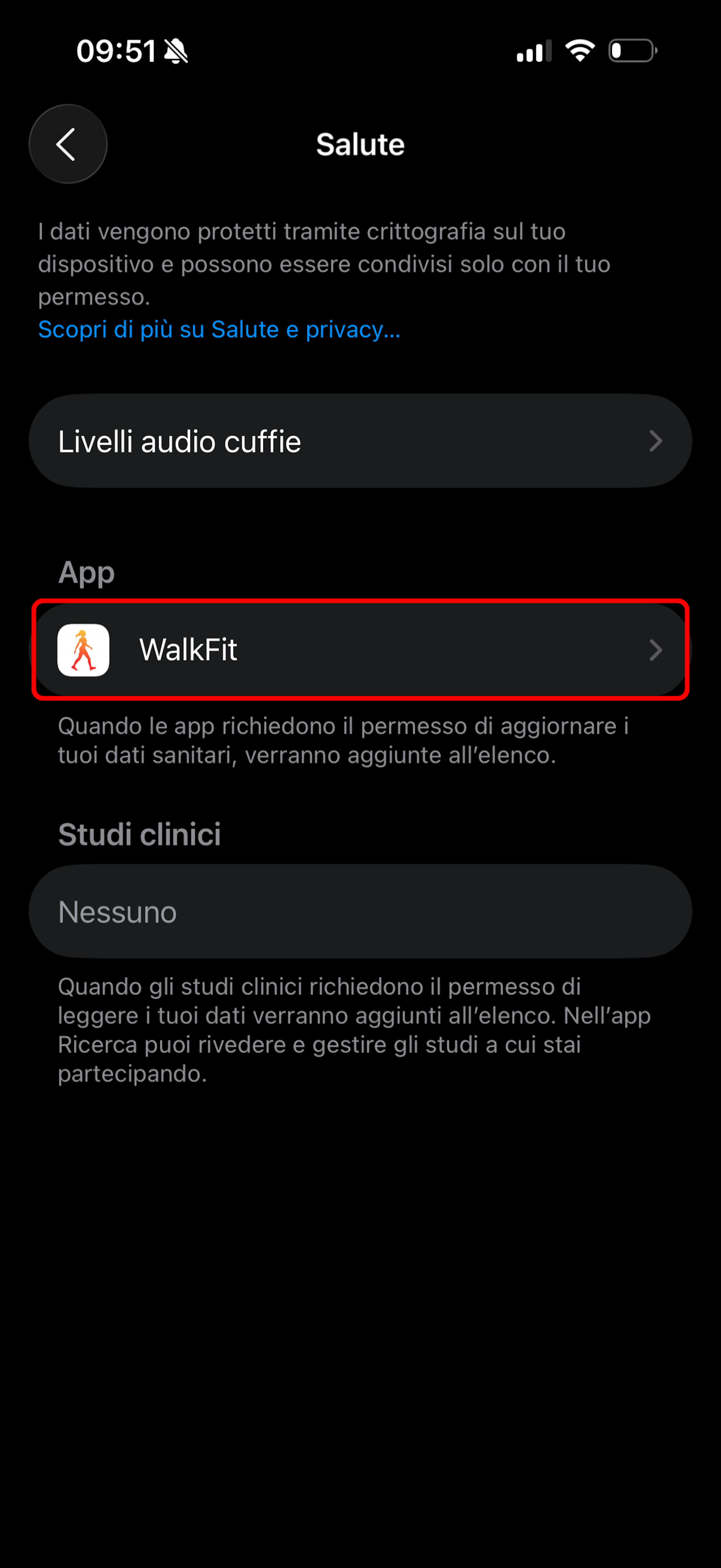 Per verificare se WalkFit è sincronizzata con l’app Salute, vai su Impostazioni sul tuo telefono > Privacy > Salute > WalkFit.