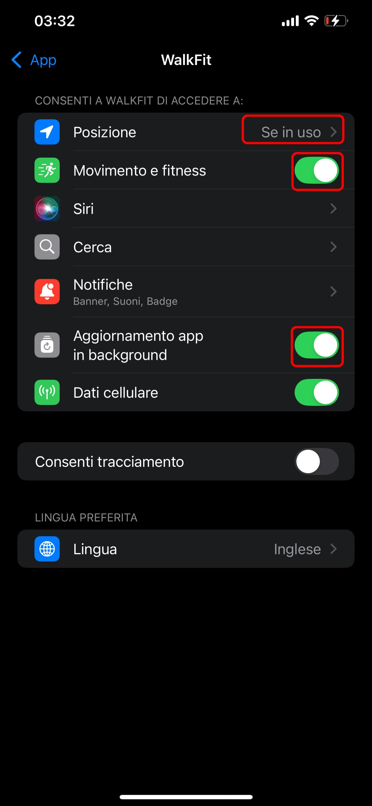Per verificare che WalkFit abbia accesso ai dati necessari, vai su Impostazioni del tuo telefono > WalkFit > Consenti a WalkFit di accedere a tutto come mostrato di seguito:
