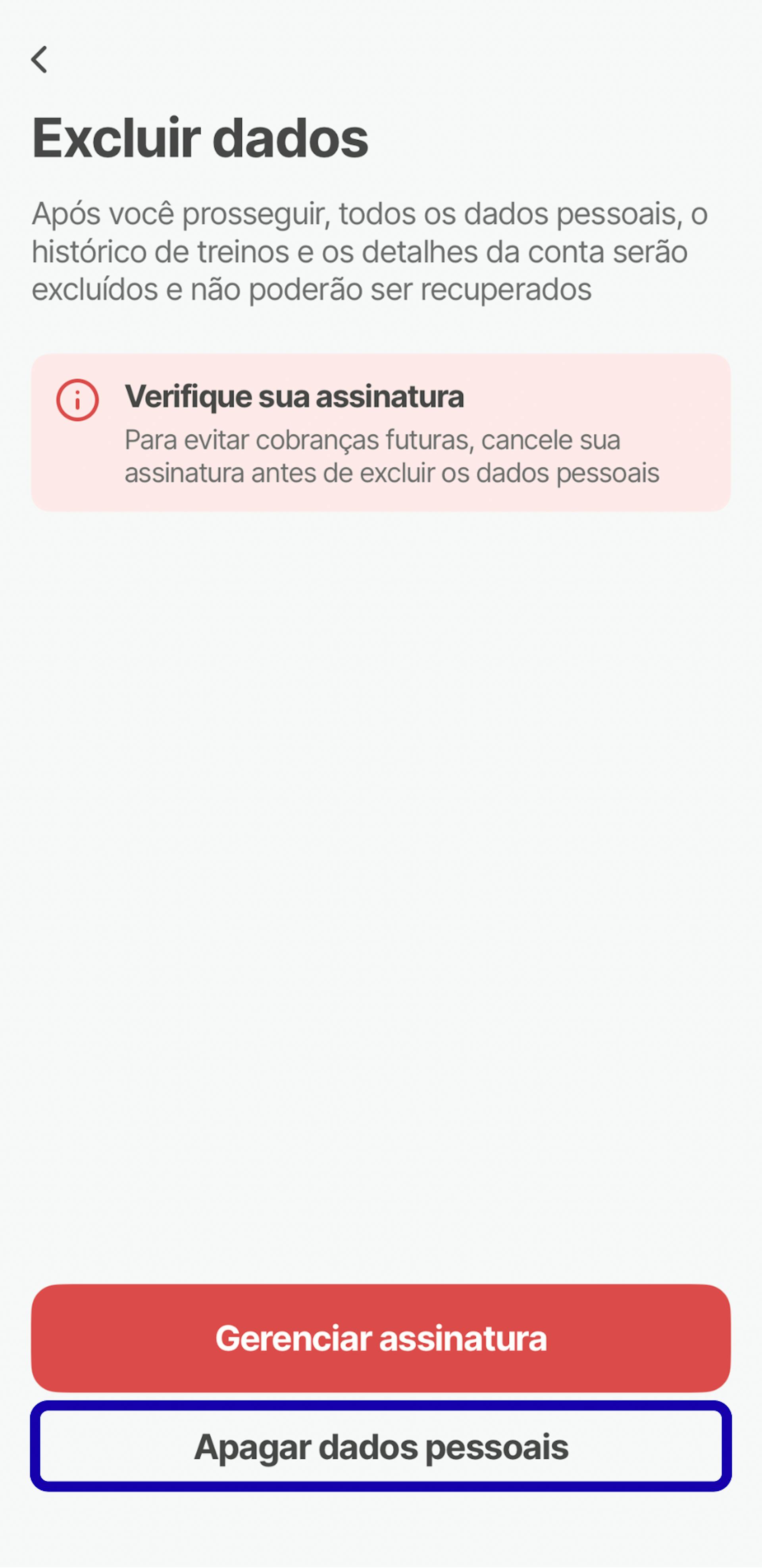 ❗Observe que a exclusão da sua conta pessoal no aplicativo resulta no cancelamento automático da sua assinatura e todo o seu progresso será apagado. Se você quiser continuar utilizando o aplicativo até o final do período de faturamento, entre em contato com a equipe de suporte para obter ajuda e recuperar o acesso à sua conta.