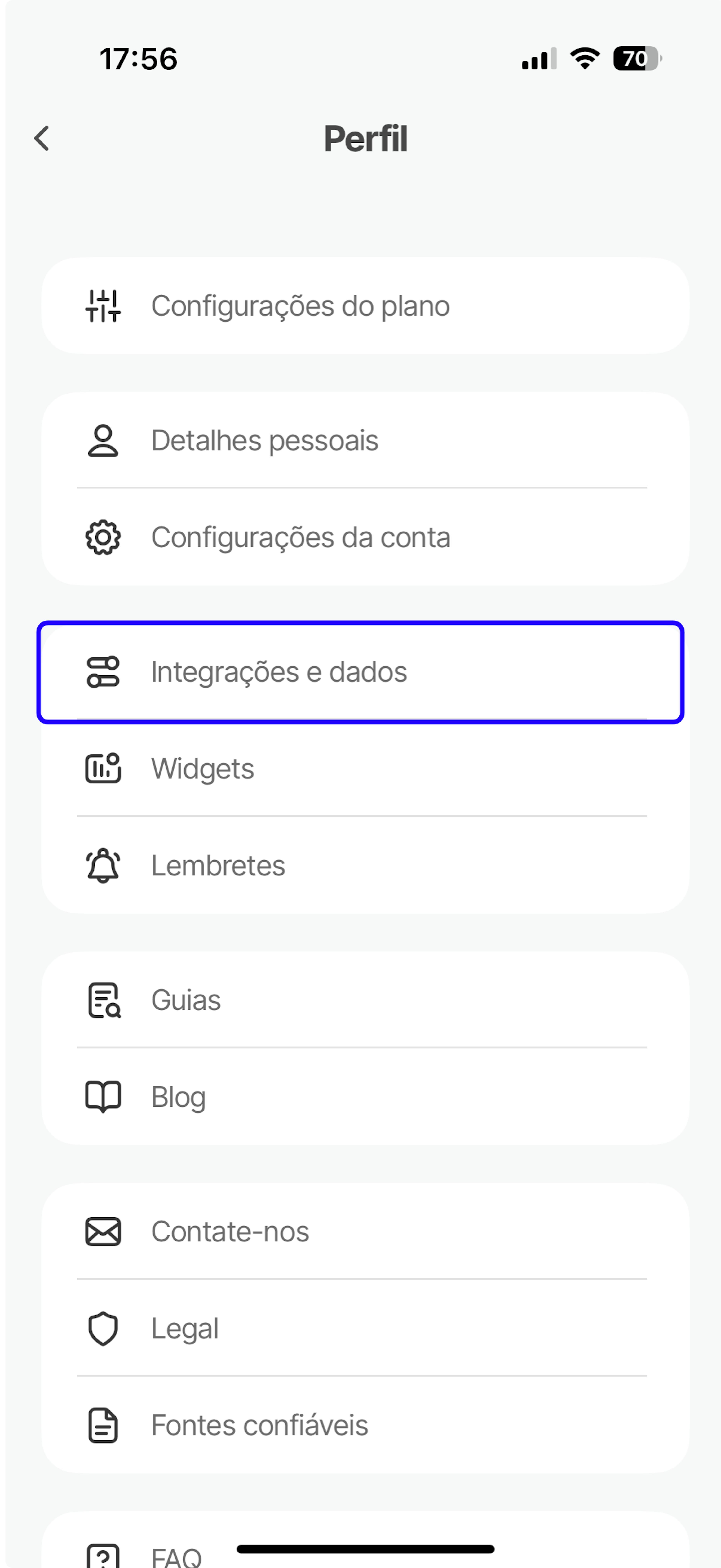 2. Toque no botão Integrações e Dados.